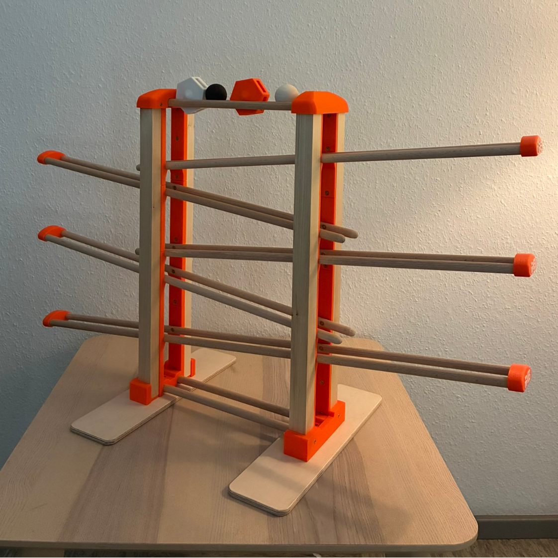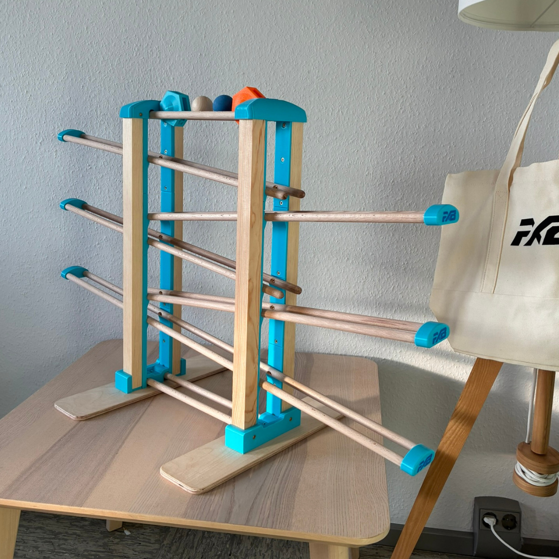 Schon beim ersten Anblick wird klar: Diese Kugelbahn ist mehr als ein Spielzeug – sie ist ein Highlight in jedem Kinderzimmer, ein Stück Handwerkskunst, das durch warme Naturtöne, klare Formen und harmonische Proportionen überzeugt.