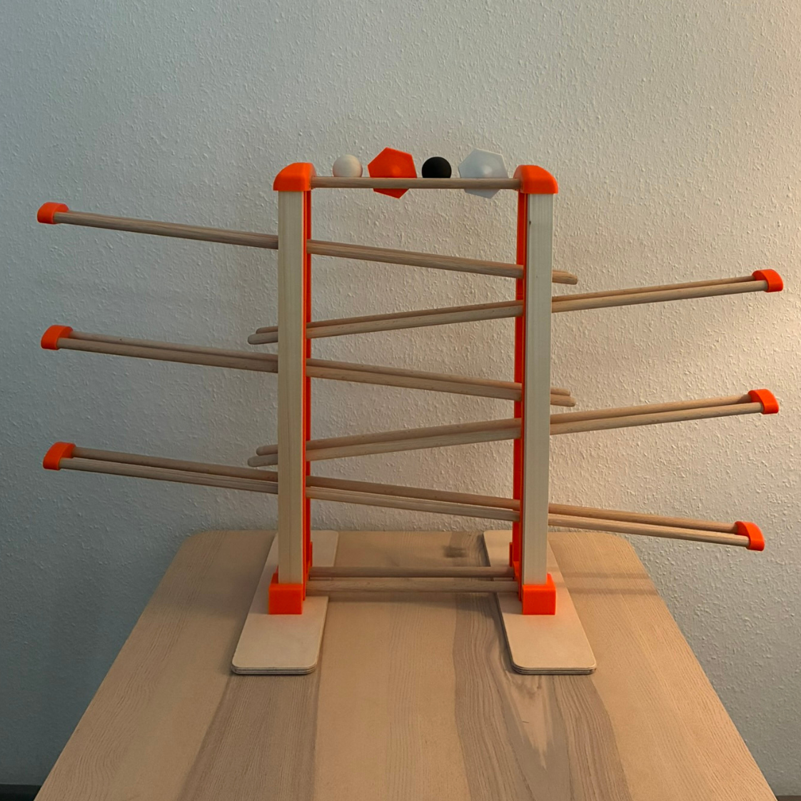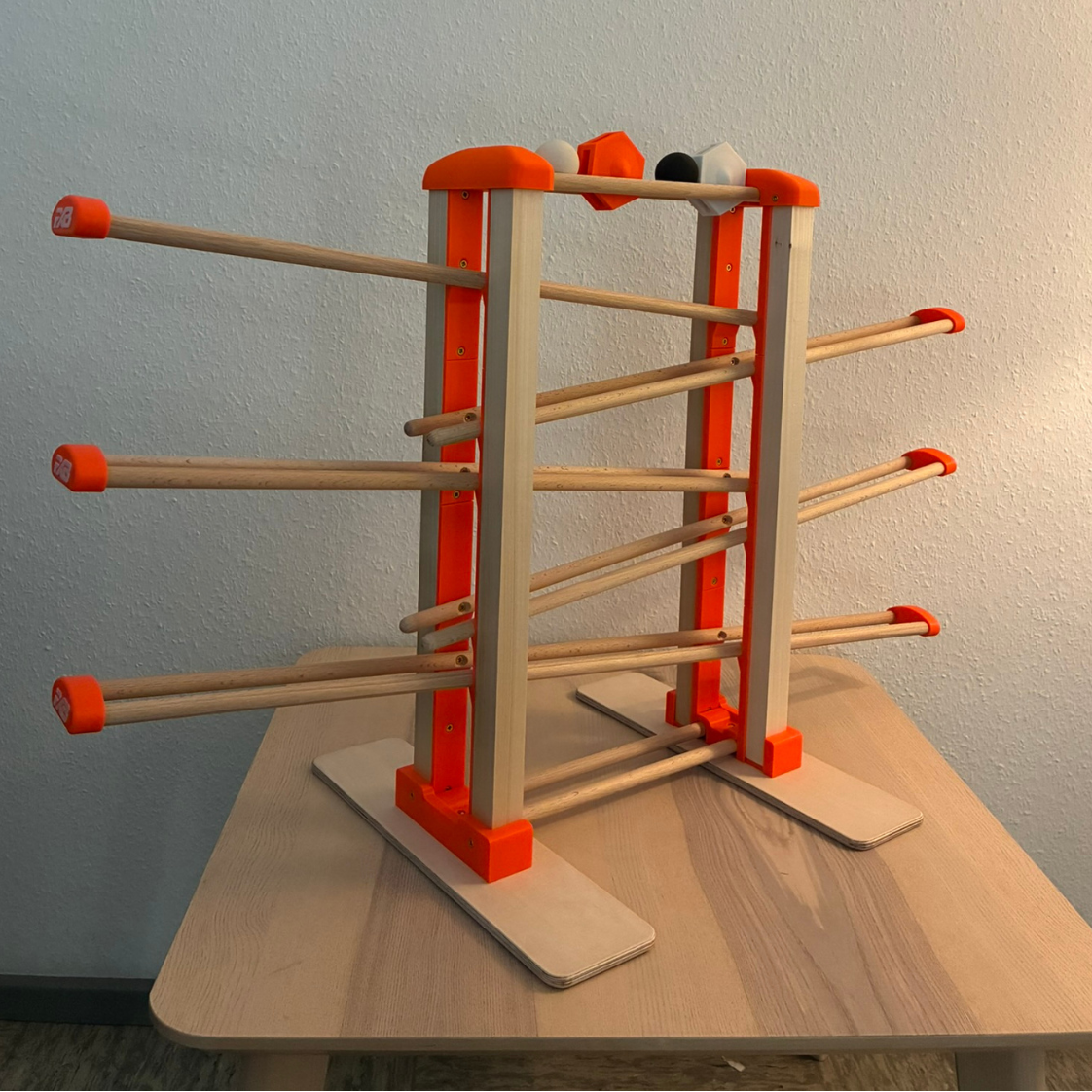 Kugelbahn hergestellt aus Kunststoff (mit Holzfilament bei beige und Kirsch) – biologisch kompatibel und ungiftig.
